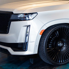 The extended wheelbase of the ESV, paired with Cadillac’s signature luxury features, makes it the ultimate family road trip vehicle. Outfitted with 26" Forgiato wheels, custom monochromatic emblem floating caps, lowering links, and custom tinted glass, this SUV exudes VIP presence. Take it a step further by adding premium paint protection film (PPF) for a custom matte champagne finish that makes a bold, unforgettable statement.